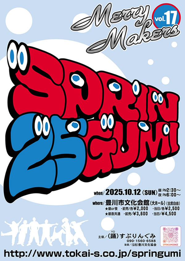 2025/10/12 Merry Makers vol.17 2024/06/16 Merry Makers vol.16 2022/12/18 Merry Makers vol.15 2021/06/27 Merry Makers vol.14 2020/12/13 20周念プチ発表会 「コロナに負けんダンス愛☆」 2020/01/19 Merry Makers vol.13 2018/06/03 Merry Makers vol.12 2016/11/06 Merry Makers vol.11 2015/05 Merry Makers vol.10 2012/07 Merry Makers vol.8 2010/11 ☆10th ANNIVERSARY☆ Merry Makers vol.7 2006/01 すぷりんぐみWebサイト OPEN!